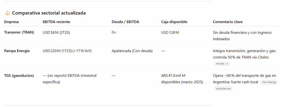 - En el caso de TGS, no hay EBITDA trimestral específico disponible públicamente. Sin embargo, disponemos de información sobre su posición de caja local de ARS 47.800 millones al cierre de marzo 2025, que respalda su solidez operativa