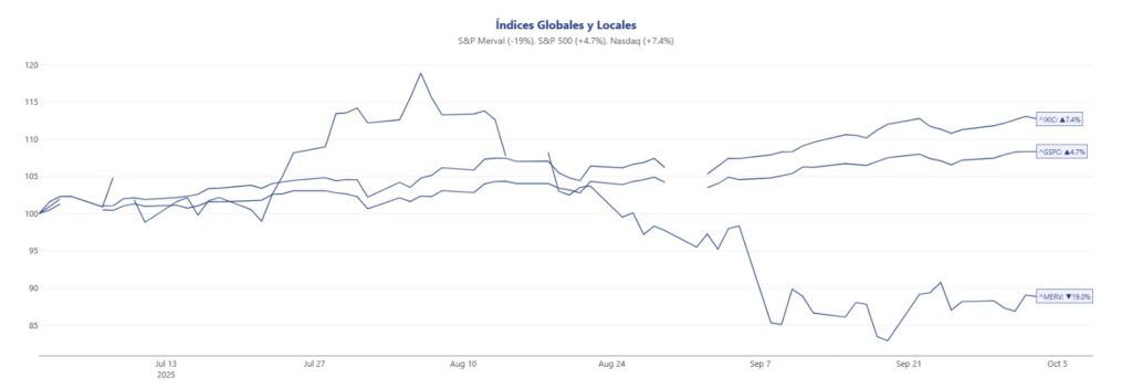 Durante la primera semana de octubre, los mercados locales e internacionales transitaron jornadas de marcada volatilidad. En Argentina, la atención estuvo centrada en las negociaciones del presidente Javier Milei con el gobierno de Estados Unidos, mientras que en el exterior la incertidumbre aumentó tras el cierre parcial del gobierno norteamericano y los débiles datos de empleo. Las acciones argentinas sufrieron fuertes correcciones, mientras que la renta fija y los instrumentos dólar linked concentraron el interés del mercado.