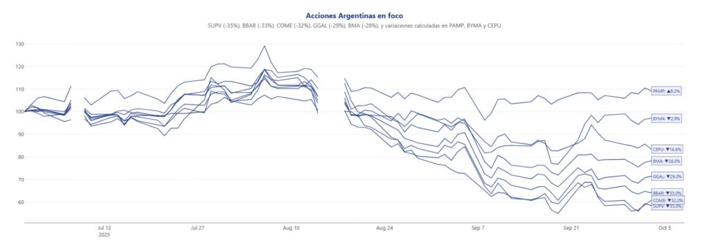 Las principales bajas mensuales fueron SUPV (-35%), BBAR (-33%), COME (-32%), GGAL (-29%) y BMA (-28%), reflejando la sensibilidad del sistema financiero ante la suba del riesgo país y la falta de definiciones políticas antes de las elecciones del 26 de octubre.