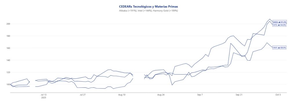 El sector tecnológico sigue liderando el rally global. OpenAI alcanzó una valuación récord de USD 500.000 millones, superando a SpaceX, mientras que NVIDIA anunció una inversión de USD 100.000 millones en nuevos centros de datos. Entre los CEDEARs más destacados, Alibaba (+191%), Intel (+144%) y Harmony Gold (+189%) encabezan las subas del año, reflejando el fuerte apetito inversor por tecnología y materias primas.