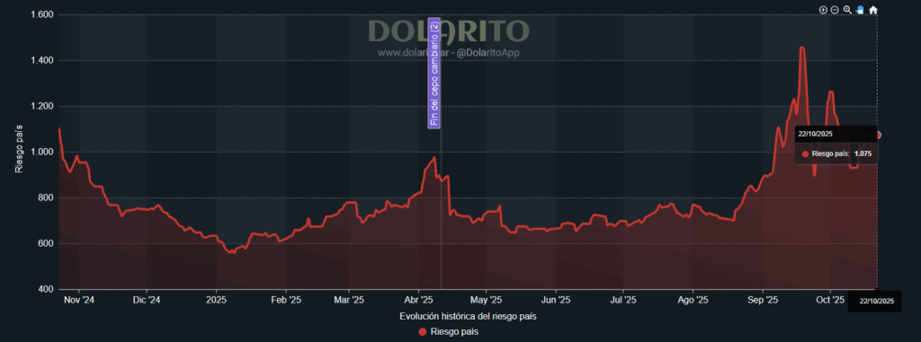 En paralelo, el riesgo país argentino —que había alcanzado mínimos cercanos a 600 puntos en marzo— volvió a escalar por encima de los 1.000 puntos básicos hacia octubre, en línea con la volatilidad preelectoral y la recomposición de las paridades de los bonos.